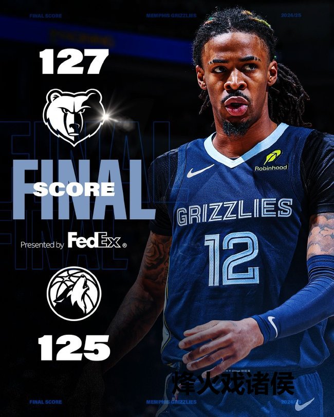 灰熊(25-14):贾伦·杰克逊33分8篮板、贝恩21分5篮板5助攻、韦尔斯13分3抢断、莫兰特12分5篮板4助攻、、阿尔达马11分、肯纳德11分5篮板5助攻、布兰登·克拉克10分4篮板